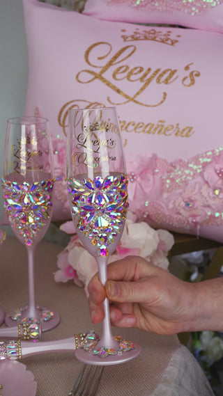 Light blue quinceanera paquetes of Money Card Box, Glass, Teddy Bear, pillows set and bouquet 9 inches