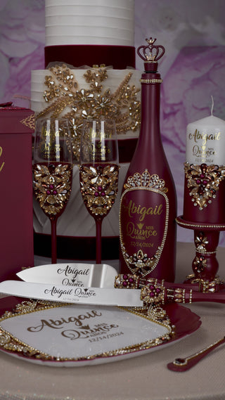 The cake moment is one of the most photographed parts of the evening. A burgundy and gold cake-cutting set with personalized engraving, a satin bow, and sparkling rhinestones brings elegance to every picture. Complete the set with a matching plate and forks for your ceremonial slice.