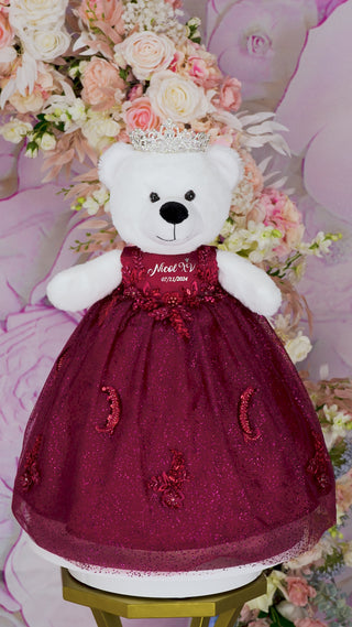 For a charming touch, consider incorporating a custom-made quinceañera teddy bear dressed in a burgundy gown with silver accents. This adorable keepsake will not only add a whimsical element to your celebration but also serve as a cherished memento of your special day.