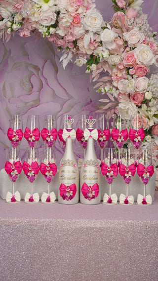 Set the scene with our fuchsia with gold quinceañera decorations, adding a touch of glamour to your venue. Our fuchsia sweet 16 centerpieces will dazzle your guests and create the perfect ambiance for your celebration. Adorn your tables with magenta glasses and fuchsia quinceañera brindis copas, adding sophistication to every toast.
