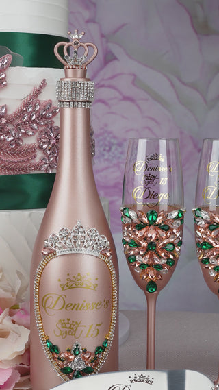 Make your cake-cutting moment stand out with our elegant quinceañera cake knife set, featuring beautiful rose gold accents that complement the fresh green theme. Pair it with our luxurious quinceañera toast glasses, designed to add sophistication to every toast, creating lasting memories with your loved ones.