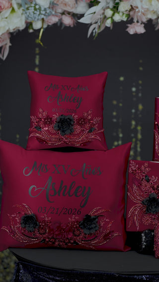 Burgundy Black Quinceanera package of pillows set, Bible, rosary and guest book