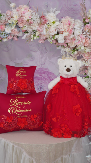 Red with flowers Quinceanera pillows set and teddy bear