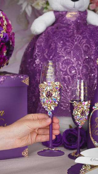 Juego de cuchillos para pastel de quinceañera con ciruela, plato y tenedor