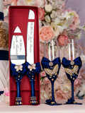 Juego de cuchillos para pastel de quinceañera azul marino con mariposas y 2 vasos