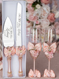 El juego de cuchillos para pastel con 2 copas con temática de quinceañera en oro rosa es una incorporación sorprendente para su celebración. Con un cuchillo para pastel y una pala de hermoso diseño, junto con dos copas a juego, este juego en tonos rosa suave agrega elegancia a su día especial. Perfecto para la ceremonia de corte de pastel y brindis, crea momentos memorables. Los detalles personalizados del juego lo convierten en un recuerdo preciado que durará mucho después del evento.